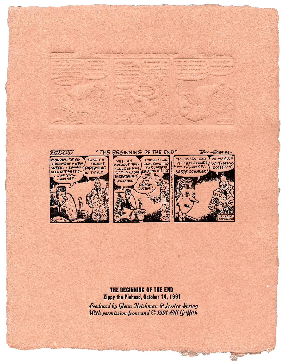 This unique letterpress-printed work on handmade paper, suitable for framing, showcases a 1991 Zippy the Pinhead comic strip by re-creating the cartoon on a single sheet as a historic printing mold (a "mat" or "flong") and as a letterpress print.